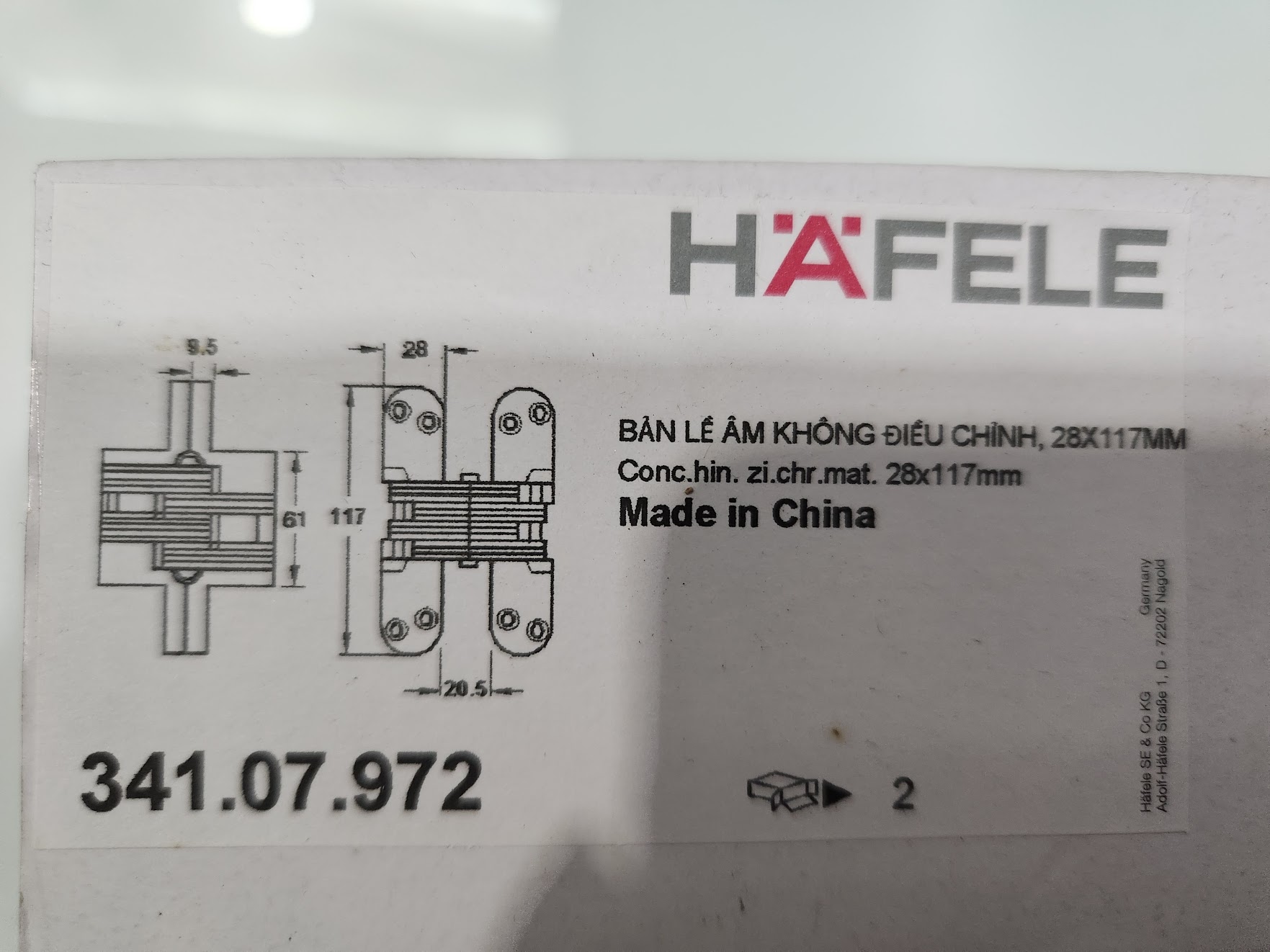 Bản lề âm Hafele không thể điều chỉnh