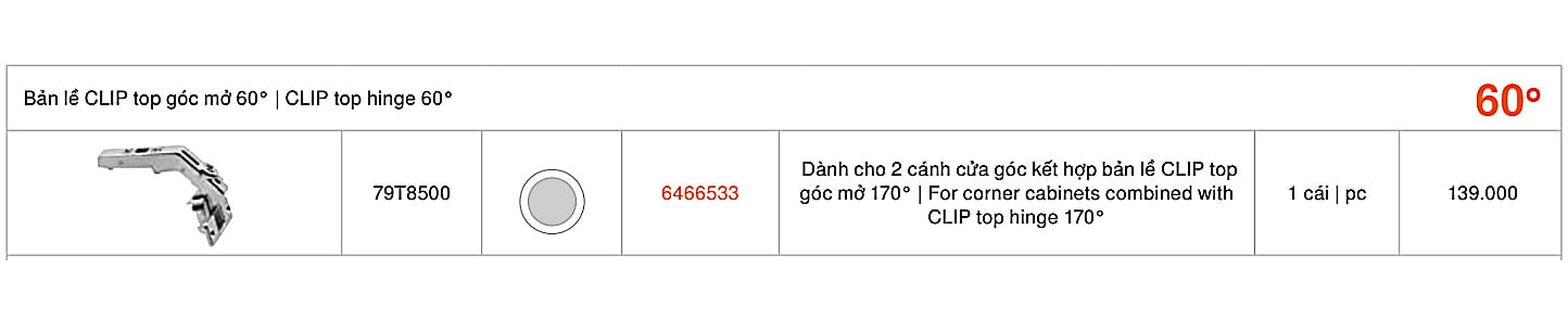 | 79T8500 | 6466533 | Dành cho 2 cánh cửa góc kết hợp bản lề CLIP top góc mở 170° / For corner cabinets combined with CLIP top hinge 170° | 1 cái / pc |