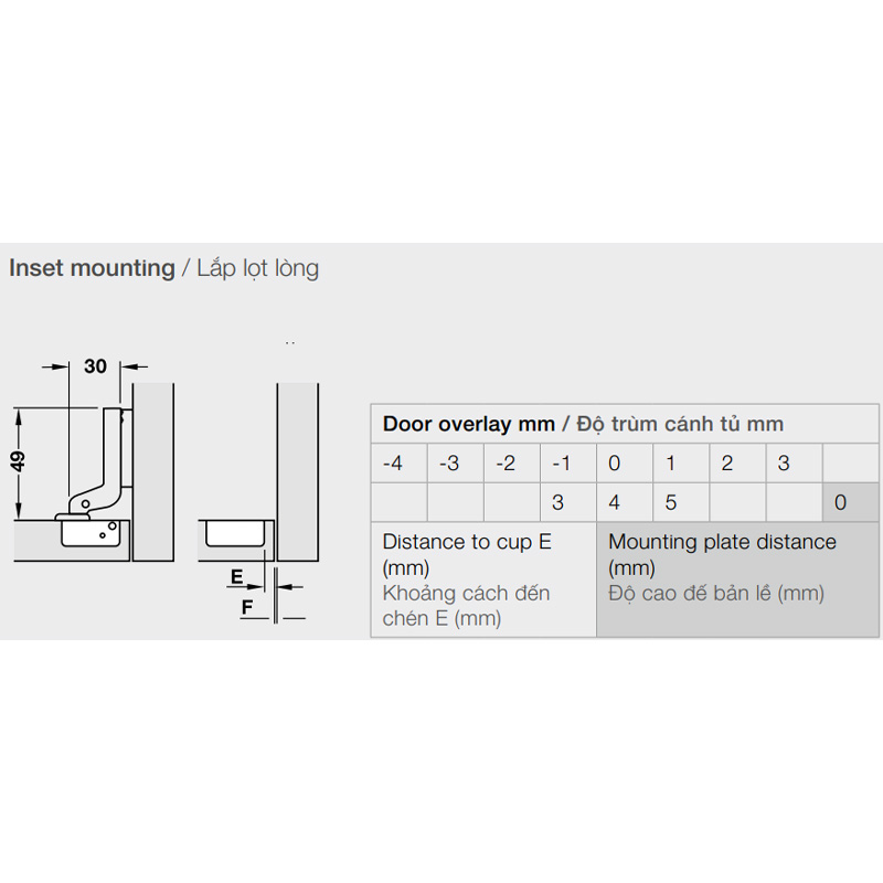 chiều cao +2 mm (qua đế bản lề), điều chỉnh chiều sâu
