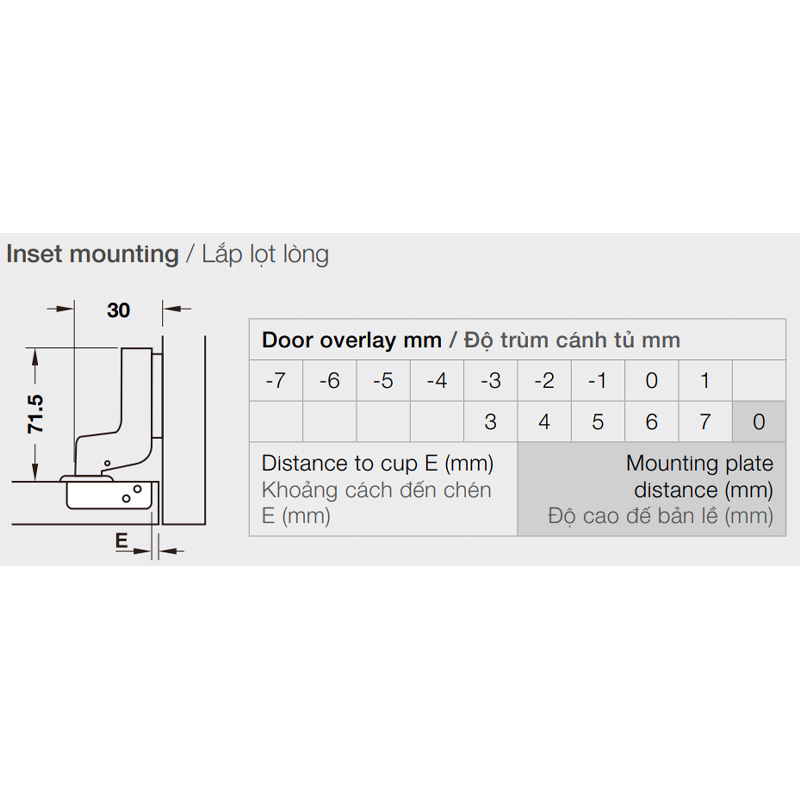 Điều chỉnh: phải trái ±2 mm; chiều cao ±2 mm (bằng đế bản lề); chiều sâu -0.6, +3 mm