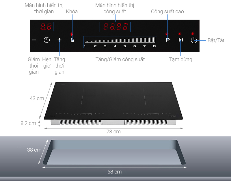 + Vùng bên phải: Ø195 mm - 2/2.2 kW (gia nhiệt nhanh)