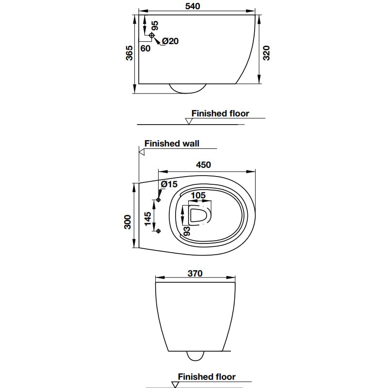 • Bồn cầu treo tường màu trắng 540 x 370 x 365 mm