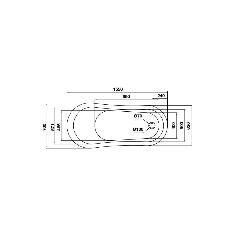 • Bồn tắm độc lập hình bầu dục, bằng acrylic màu trắng• Kích thước: 1550x700x800mm• Dung tích: 210 lít• Đường xả dưới chân bồn tắm, không gồm xả tràn• Đã bao gồm bộ xả và ống thải