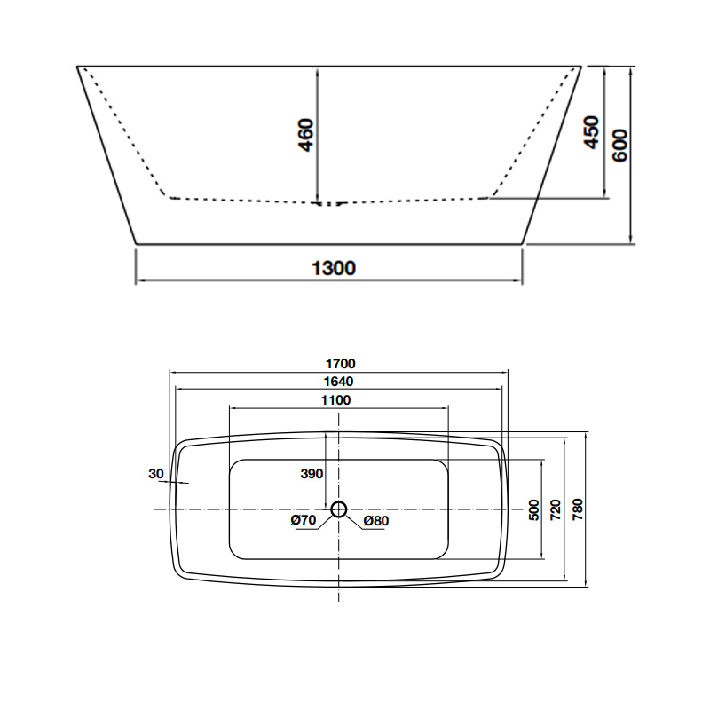 • Bồn tắm độc lập hình chữ nhật, bằng acrylic màu trắng• Kích thước: 1700x780x600 mm• Dung tích: 245 lít• Đường xả dưới chân bồn tắm• Đã bao gồm bộ xả và ống thải