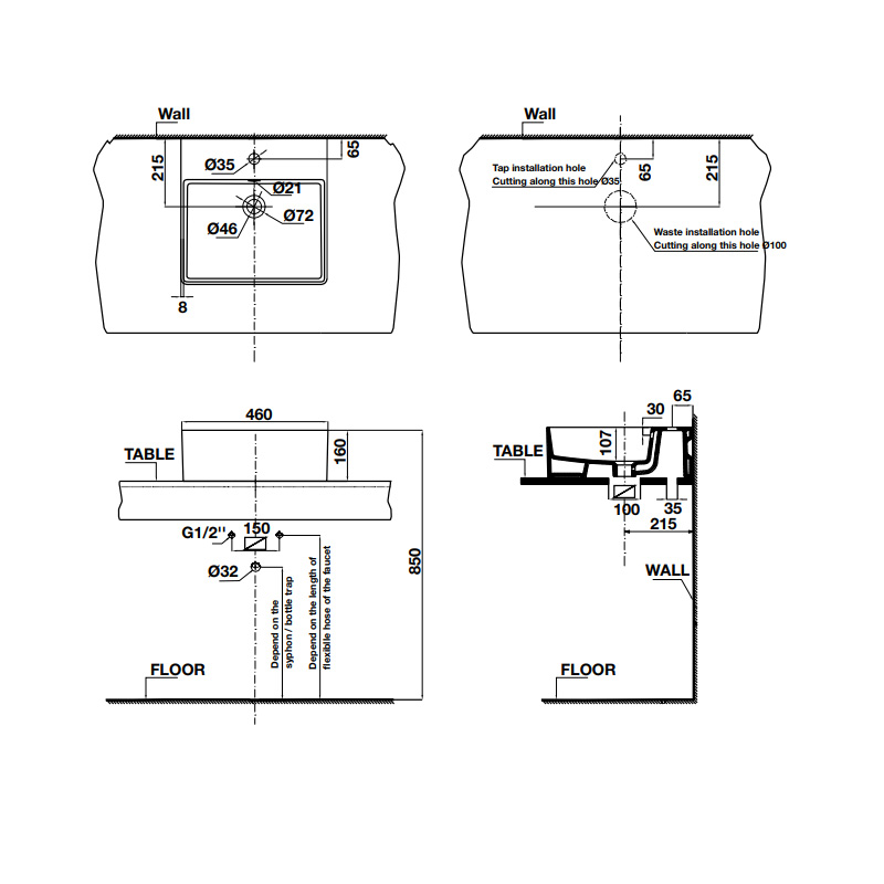• Kích thước: 460x460x160• Tráng men nano• Hoàn thiện: Trắng• Có lỗ gắn vòi• Có xả tràn• Đặt riêng siphon và bộ xả