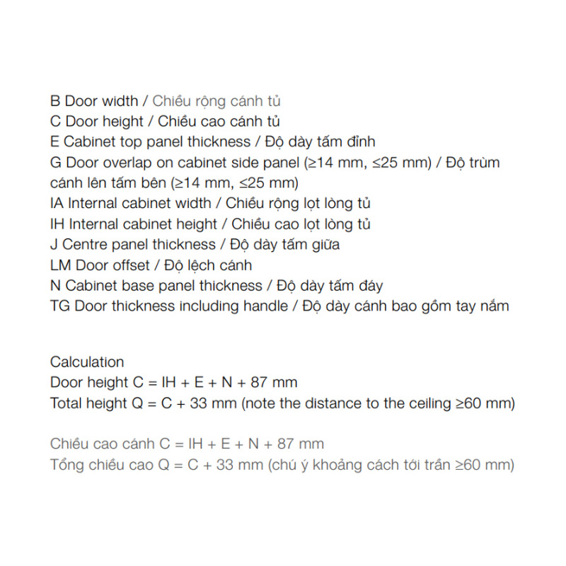 • Phiên bản: Cho 2 cánh• Chiều rộng tủ lọt lòng: 1731-2130 mm• Đối với độ dày cửa: 18 – 35 mm• Có cơ chế đóng giảm chấn từ tính