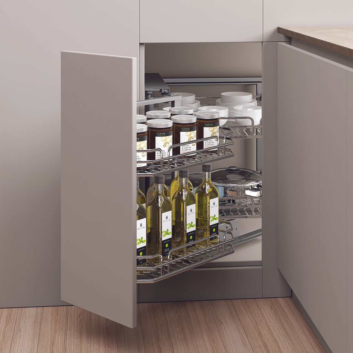 Tận dụng không gian góc bếp để lưu trữ. Cơ chế kéo liên hoàn giúp người sử dụng có thể dễ dàng lấy đồ lưu trữ trong khu vực góc bếp nhanh chóng và tiện lợi.
