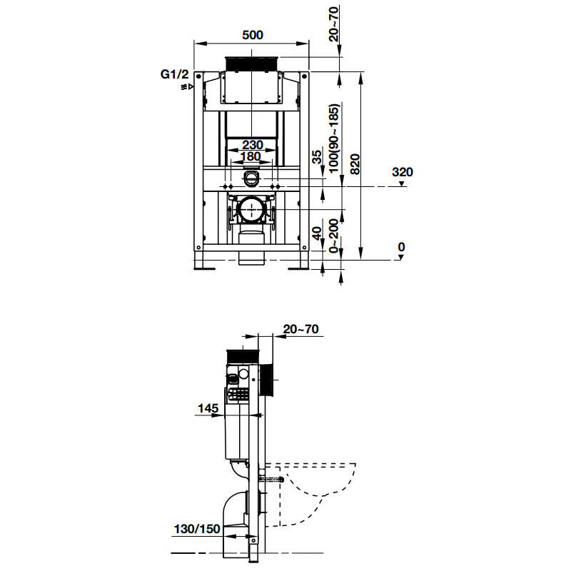 • Khoảng cách lắp bồn cầu vào khung đỡ 180/230 mm