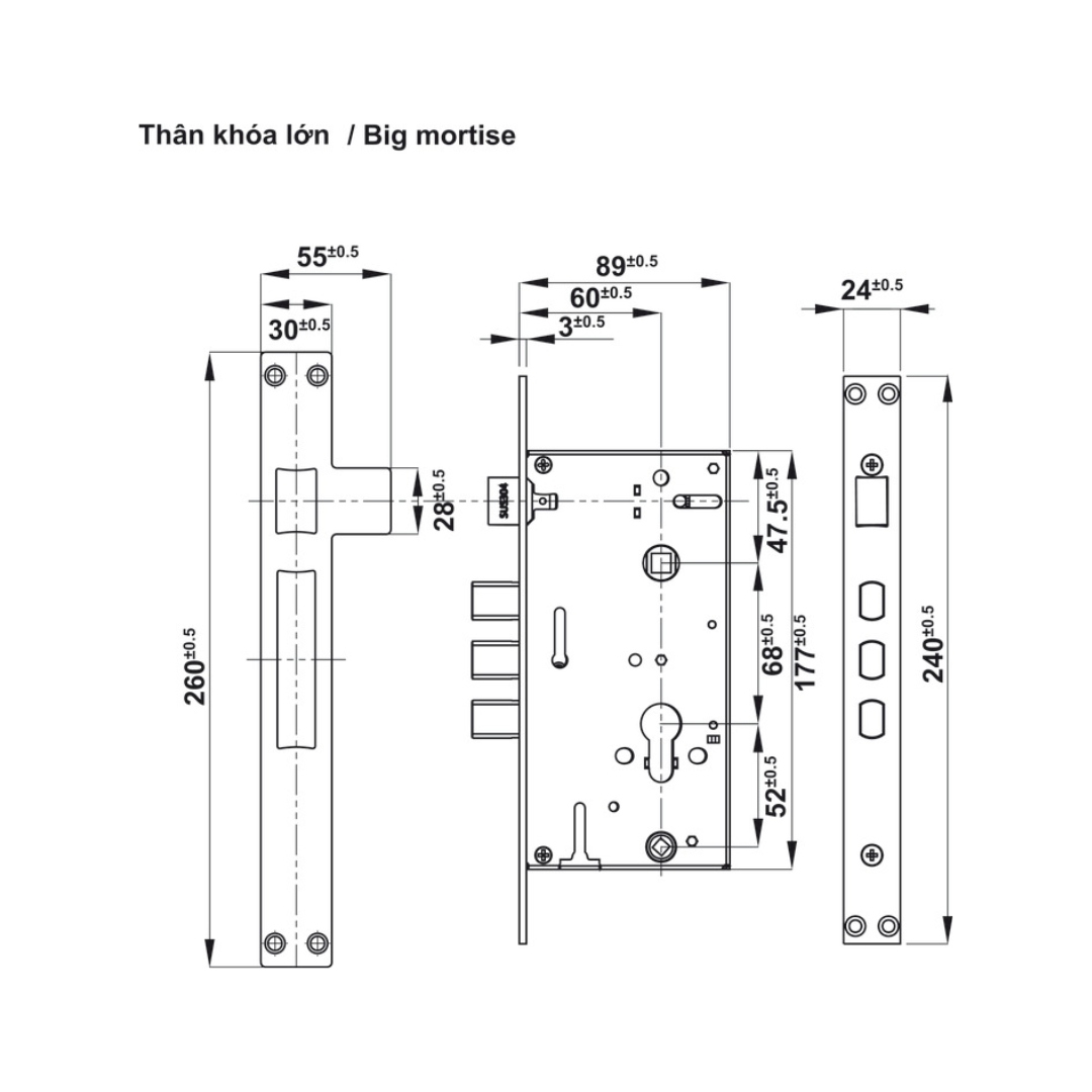 - Thân khóa lớn: 38 - 60 mm