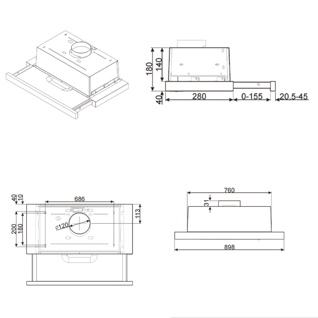 - Đường kính ống xả Ø 120 mm