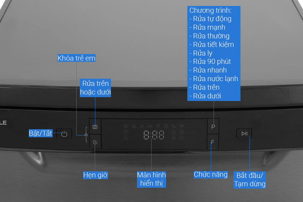 8 chương trình rửa: Rửa tự động, Rửa mạnh, Rửa thông thường, Rửa tiết kiệm ECO, Rửa ly, Rửa 90 phút, Rửa nhanh, Rửa ngâm tráng qua nước lạnh