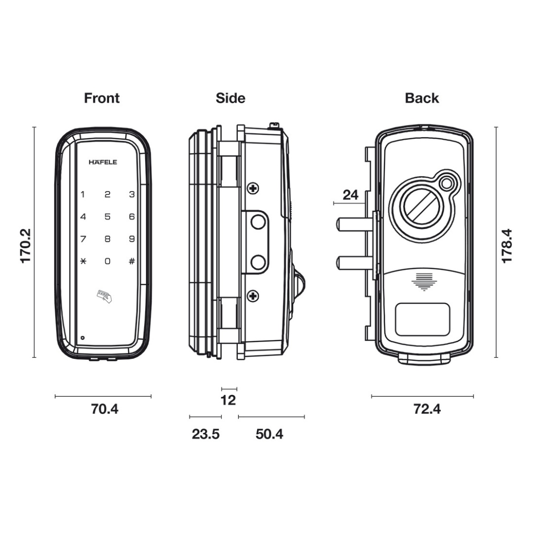 + Kích thước thân khóa trong: 72.4 x 174.4 x 47.65 mm