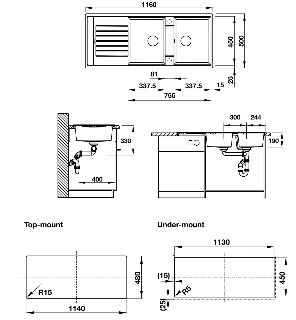 • Kích thước mỗi bồn: 337,5D x 450R mm
