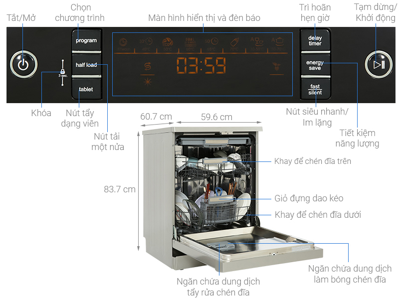 - Chức năng đặt biệt: rửa nửa tải.