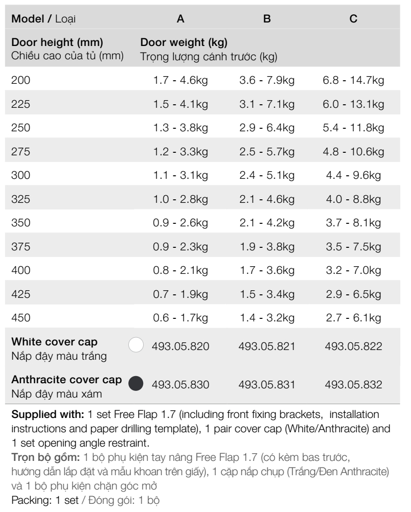 TAY NÂNG HAFELE FREE FLAP 1.7 Dành cho cửa tủ 1 cánh được làm bằng gỗ, kính hoặc có khung nhôm